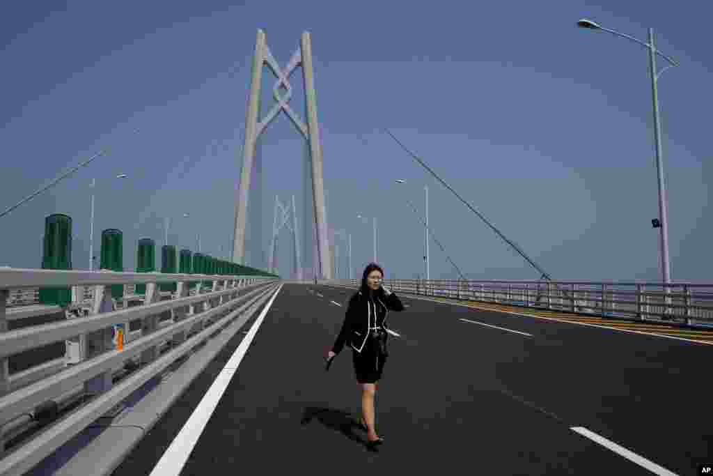 广东珠海的港珠澳大桥,一名女士走在桥上(2018年3月28日)。