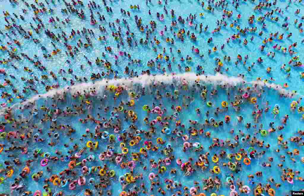 在摄氏35度的高温下,人们在南京水上公园避暑 (2015年8月1日)。