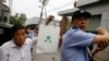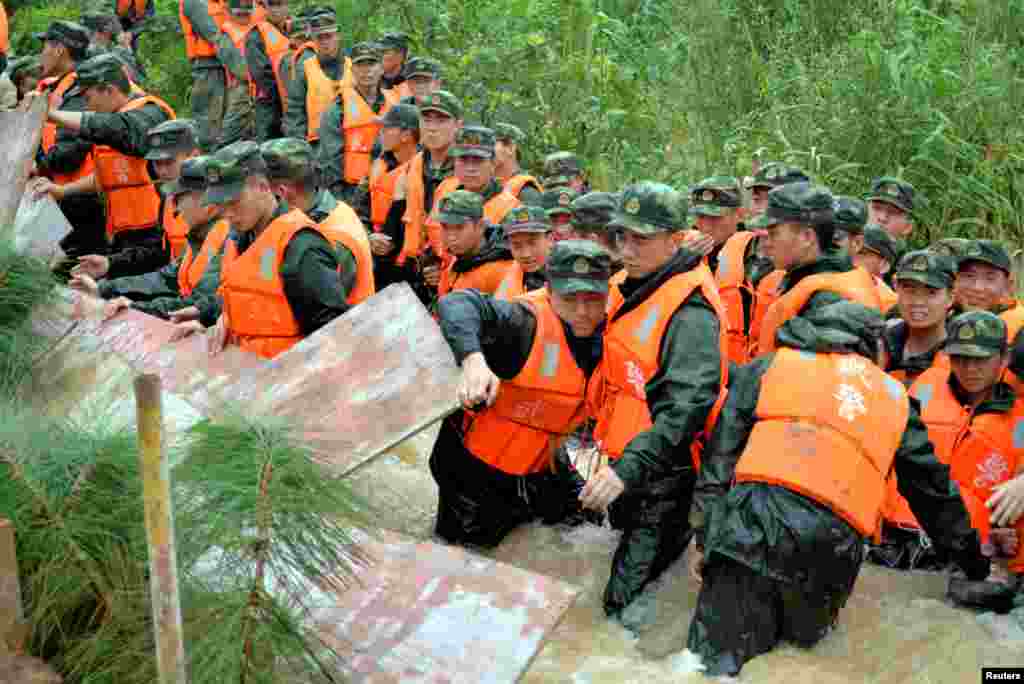 2016年7月3日,中国武警在南京列队阻止洪水。