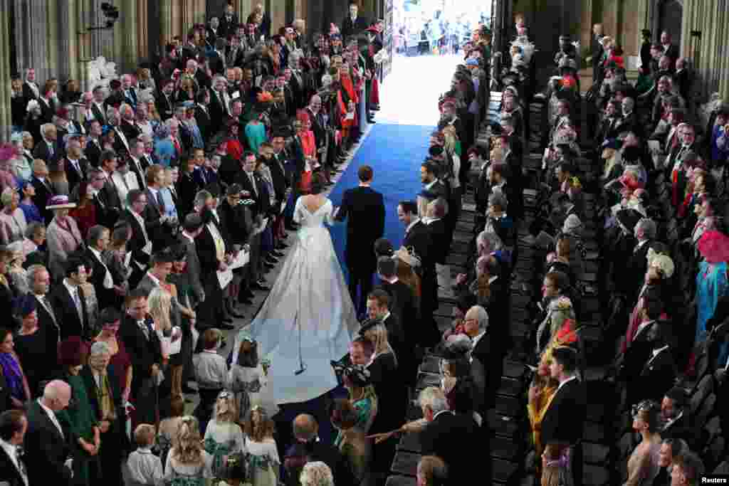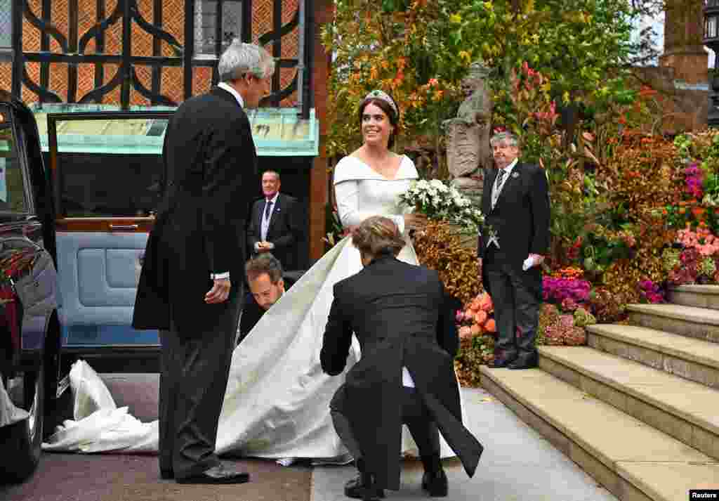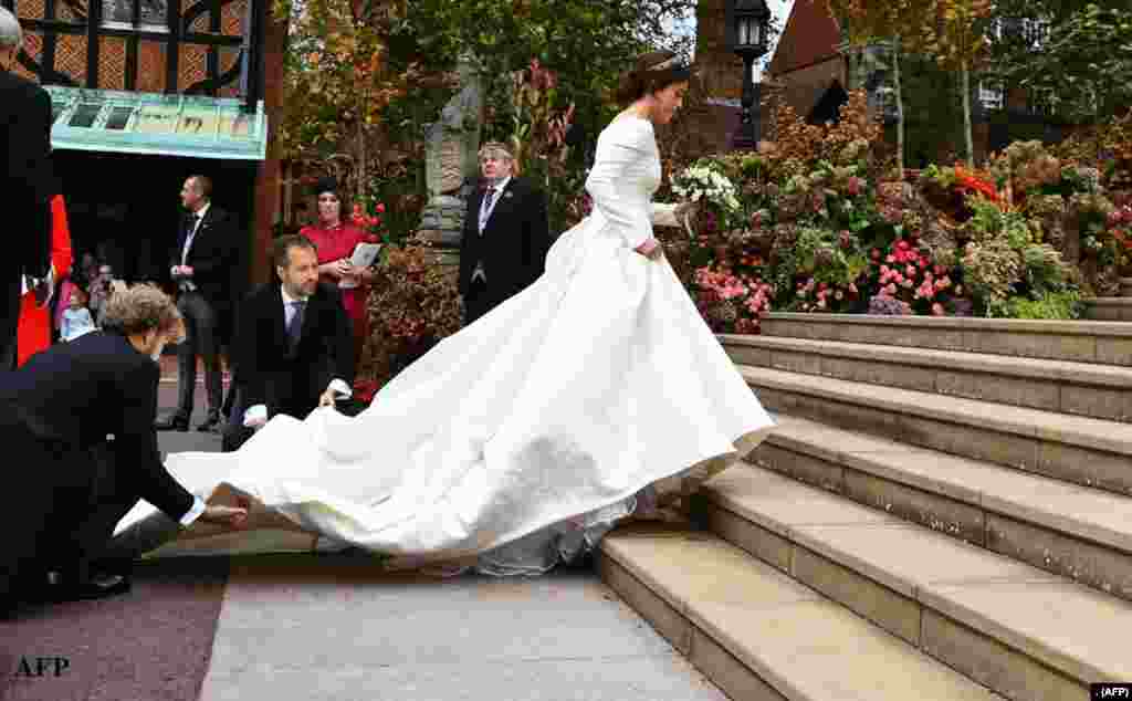 英国约克公主尤金妮于2018年10月12日在英国伦敦附近的温莎城堡走上教堂的台阶,参加婚礼。