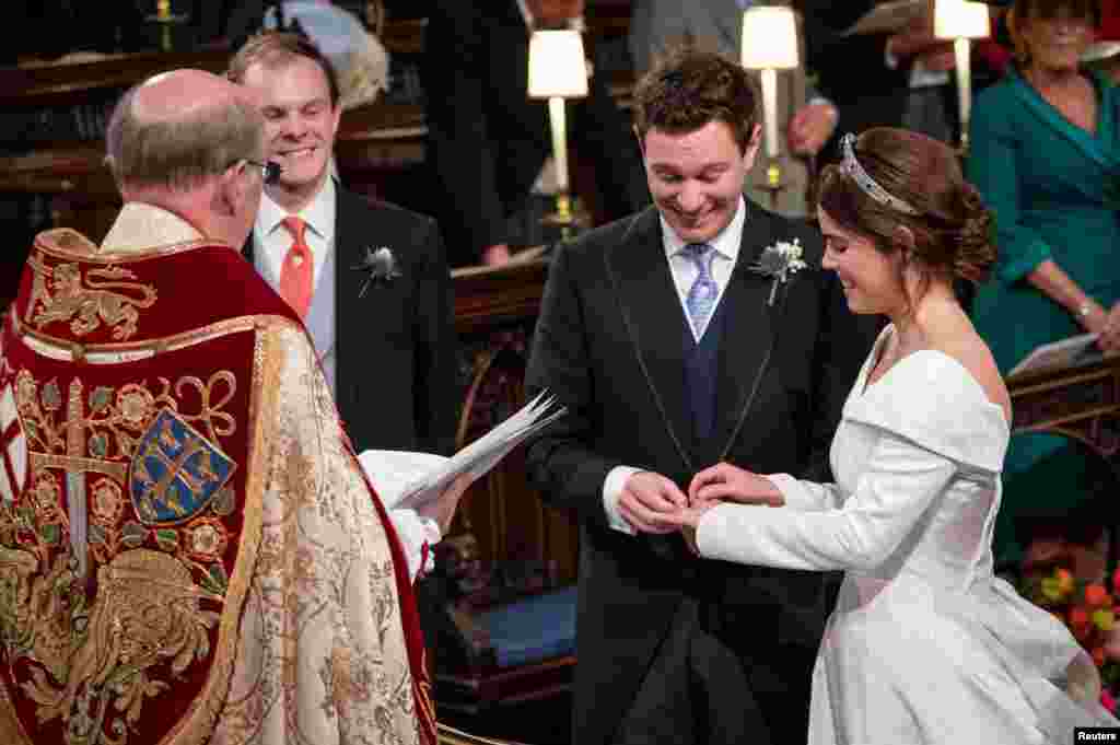 2018年10月12日在英国温莎城堡圣乔治教堂举行的婚礼中,布鲁克斯班克给英国公主尤金妮戴上戒指。今年32岁的布鲁克斯班克是酒商,出身平民家庭,与尤金妮公主7年前结识。