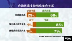 虽然根据《台湾关系法》,华盛顿与台北之间的关系属于非官方性质,不过皮尤研究中心的数据显示,台湾民意不但强烈支持与美国发展经贸关系(85%),而且也强烈支持与美国强化政治关系(79%)。当被问到美国国会近来通过一连串友台法案,进一步强化美台双边关系,是不是促使台湾民众对美国抱持好感的原因之一,谭妲表示:“我们在调查时并未询问台湾民众对特定政策或法案的看法,但我们从数据中的确能看出,台湾民众对美国具有非常高的好感与支持度,在每个年龄段都至少有平均七成的台湾民众支持与美国加强经贸与政治关系,如果只问好感度的话,在每一组年龄段的数据中也能看到大多数的台湾民众对美国抱持正面观感,虽然单靠这些观感的数据不一定有助于分析特定的政策,但我们非常确定的是,台湾民众对美台关系的强烈支持是跨越人口结构的。”