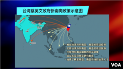 另一方面,蔡英文在外交上推行新南向政策,主要也是锁定中国一带一路包括的巴基斯坦、尼泊尔、不丹、印度、孟加拉国国、斯里兰卡等东南亚国家。内容包括: 推动台湾与东南亚、南亚的双边投资; 支持台湾与东南亚、南亚的双边旅游; 开放对东南亚国家的签证政策; 成立东亚及南亚研究智库; 培育了解东南亚、南亚市场的台湾人才等等。