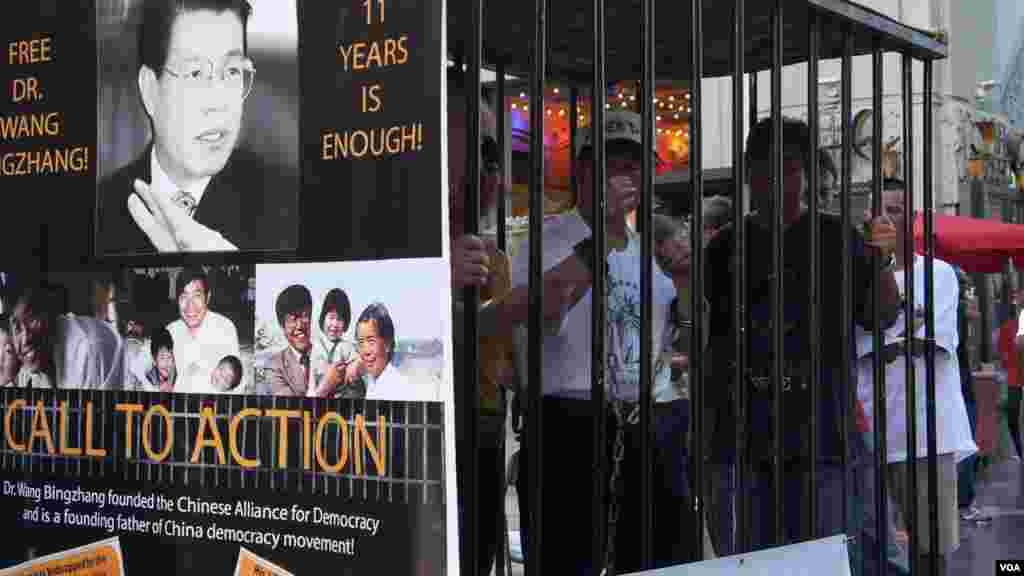 “与王炳章同囚”的行为艺术表演及海报(美国之音国符拍摄)