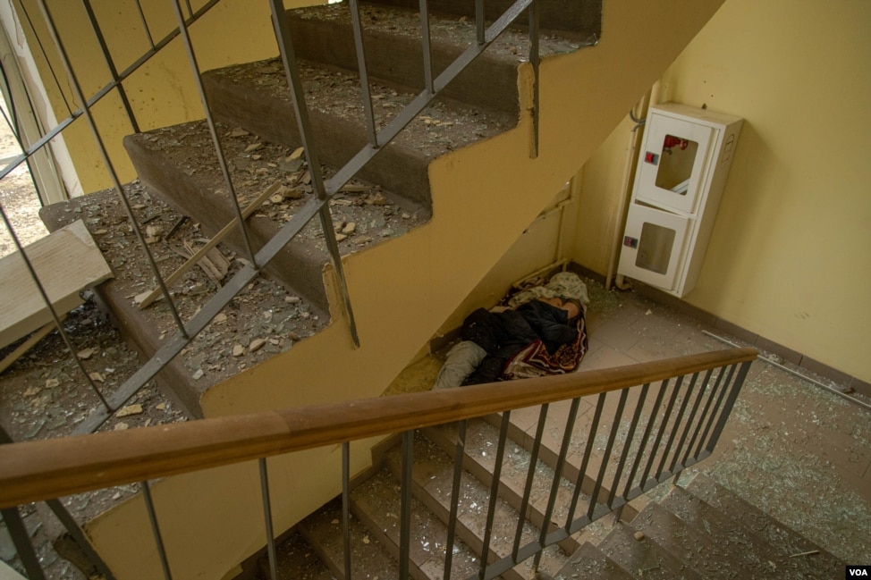 首都基辅,导弹袭击后,一幢住宅楼内的楼梯部分塌方。(2022年3月14日)