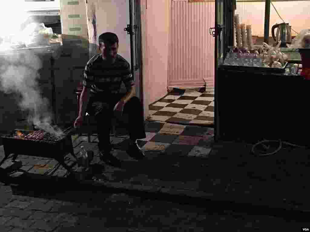 伊犁州府伊宁市一摊主在料理新疆风味 - 烤羊肉串。 (美国之音叶兵拍摄)